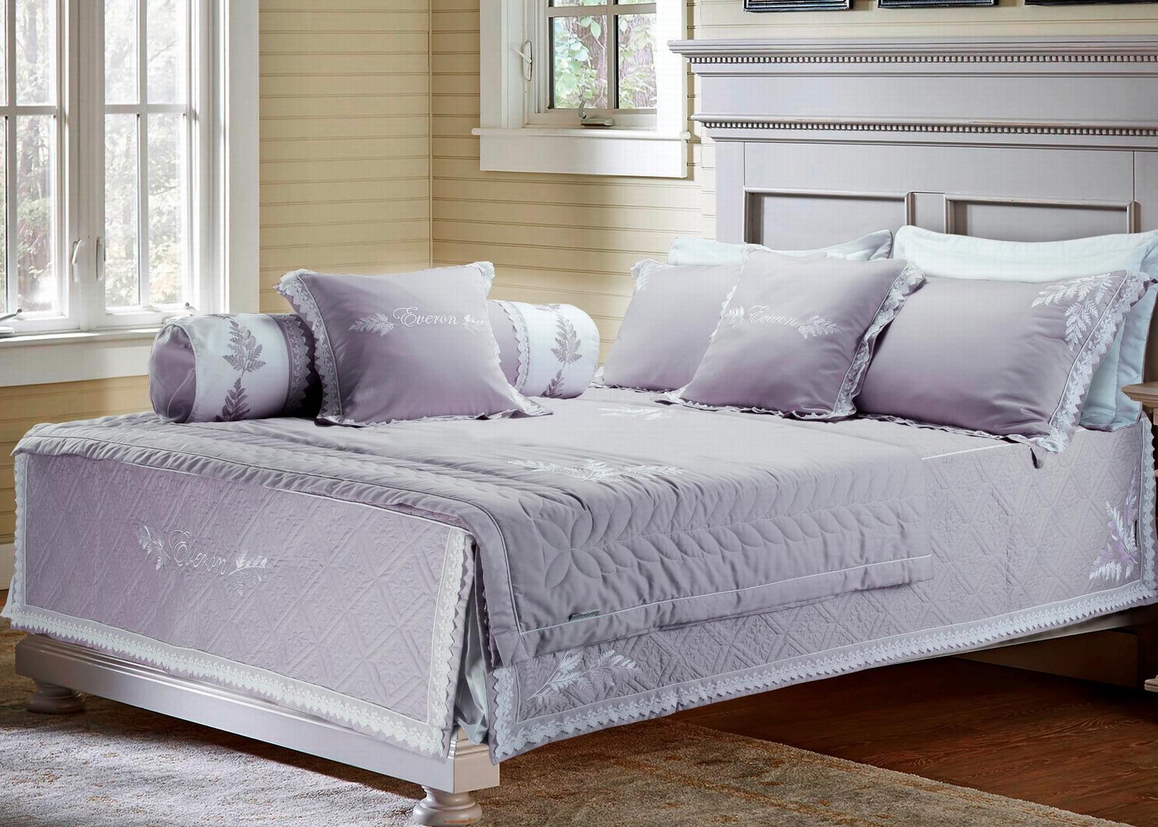 "Lấy ý tưởng từ những lá dương xỉ ngậm sương phòng thiết kế đã cho ra đời sản phẩm chăn ga ES1804 với màu vải ghi kết hợp họa tiết thêu lá dương xỉ chỉ trắng làm nên 1 bộ chăn ga vô cùng tinh tế,sang trọng như những viên ngọc hình sương lung lình huyền ảo."