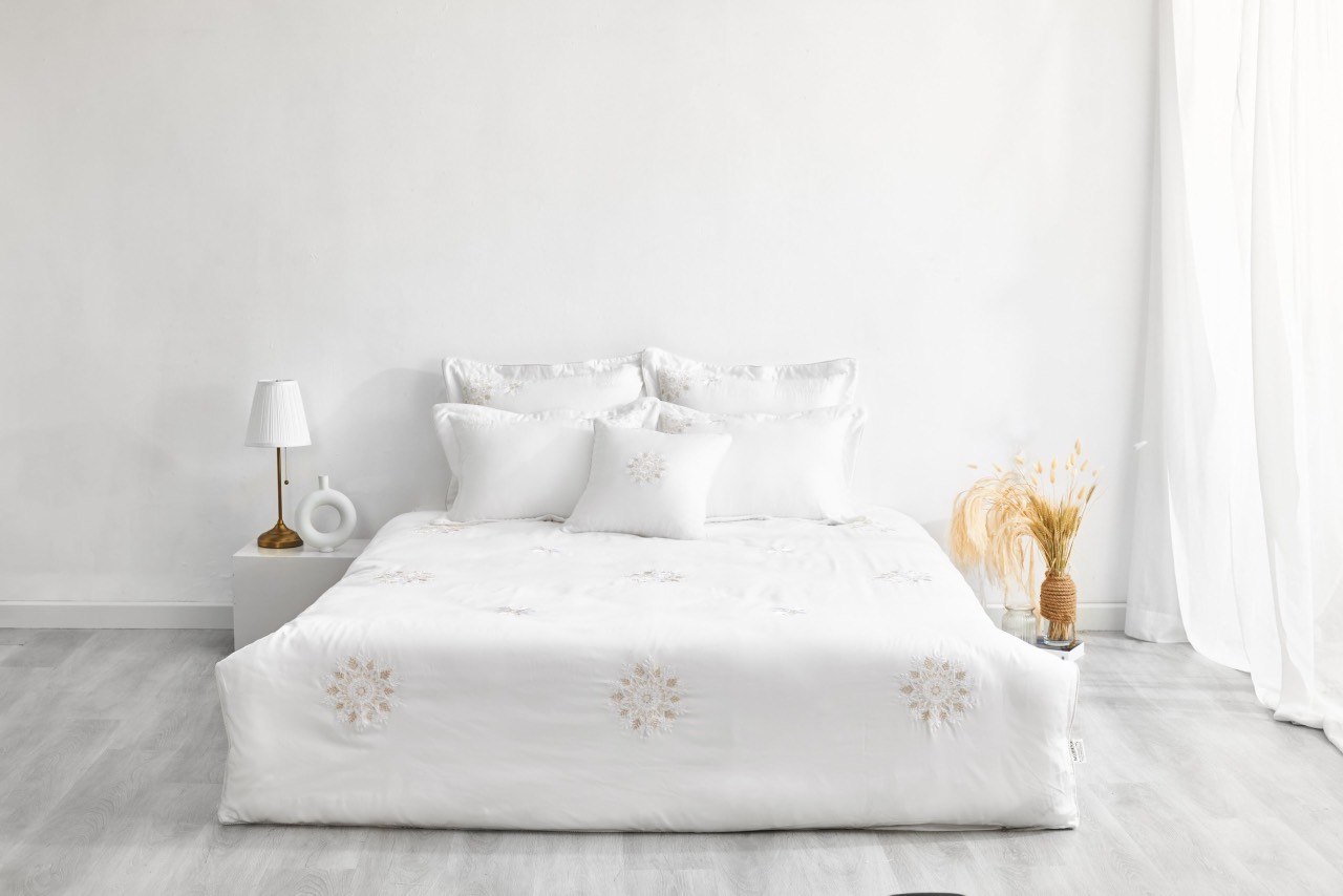 "Màu trắng tinh khôi cũng là một trong những màu sắc chăn ga được chọn lựa rất nhiều cho ngày cưới – ngày trọng đại của đời người. Không rực rỡ như váy cô dâu, không màu mè, hoa lá, bộ chăn ga trắng EST21034 vẫn thu hút tất cả ánh nhìn và mang đến cảm giác hạnh phúc lạ kỳ. Màu trắng được kết hợp cùng phong cách hoa văn hiện đại, cách điệu. Hình hoa tròn như bông tuyết nở, được rải đều khắp chăn, chỉ thêu kim tuyến ánh bạc lấp lánh tôn lên vẻ đẹp vừa quyến rũ, vừa sang trọng, ấn tượng."